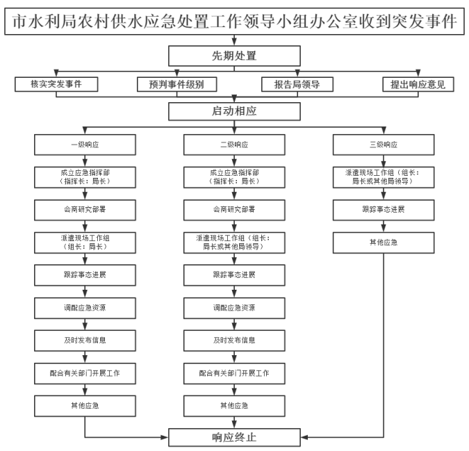 判断供水工程发生I级(重大供水安全事件)时,市水利局农村供水应急处置工作领导小组办公室报告市水利局局长和分管局领导;局长立即组织召开紧急会议,通报突发事件基本情况,审定应急响应级别,启动一级响应,响应流程图见附录2。