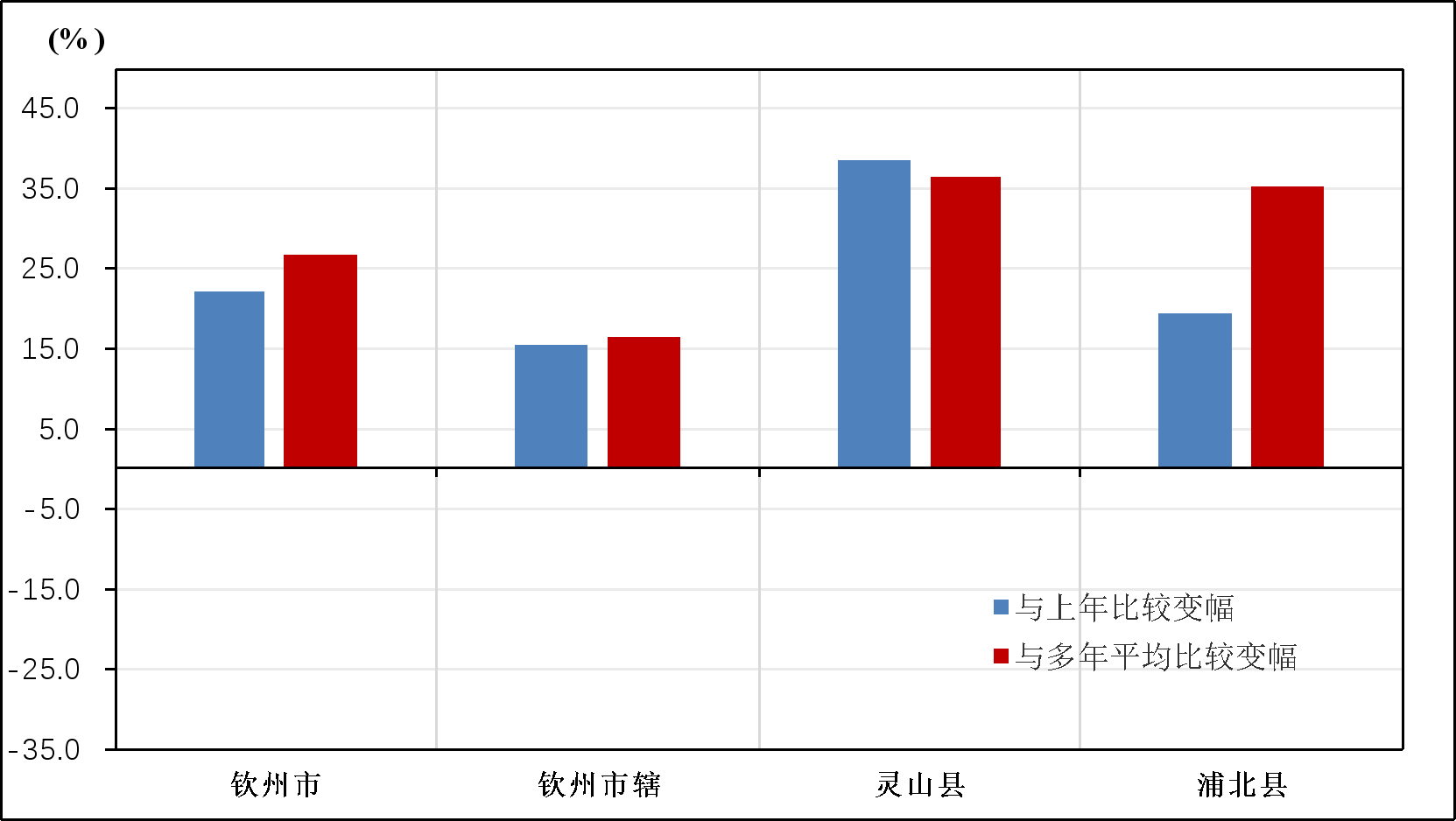 从行政分区看,降水量与上年值相比,各县(区)较2022年均增加,变幅在15.5%~38.5%之间,其中灵山县增幅最大,为38.5%。与多年平均值相比,变幅在16.5%~36.2%之间,其中偏多幅度最大的是灵山县,为36.2%。