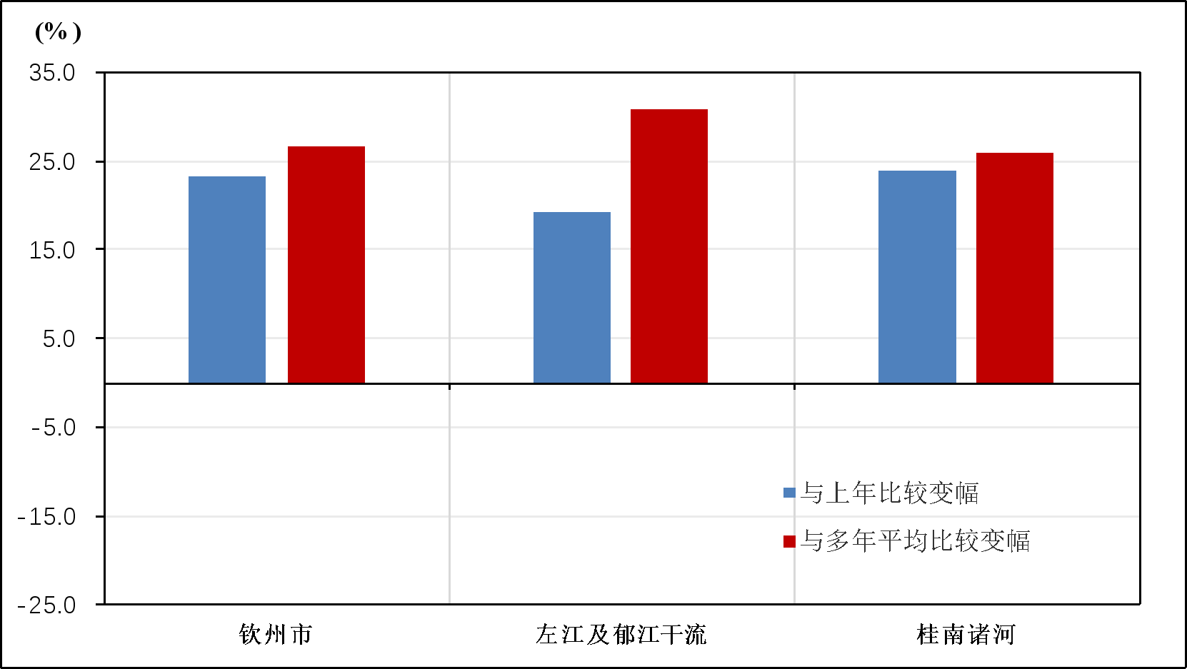 从水资源分区看,与2022年相比,左江及郁江干流、桂南诸河变幅分别为19.2%、24.0%,降水量均增加。与多年平均值相比,左江及郁江干流、桂南诸河变幅分别为31.0%、26.1%,降水量均高于多年平均值。