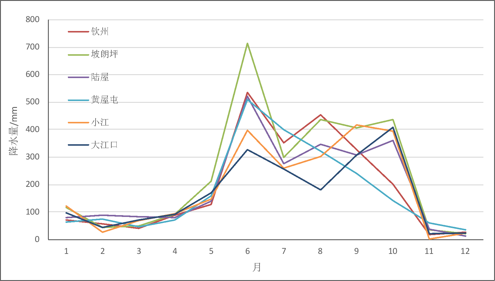 2023年钦州市降水量年内分配不均匀。从主要河流水文代表站实测降水量情况看,主要降雨代表站汛期【注】降水量占年降水量比重均在82.6%以上,汛期降水量占比由大到小分别为桂南诸河坡朗坪水文站87.5%、桂南诸河钦州水位站86.8%、桂南诸河小江水文站85.1%、桂南诸河陆屋水文站83.6%、桂南诸河黄屋屯水文站83.5%、郁江大江口水文站82.6%。