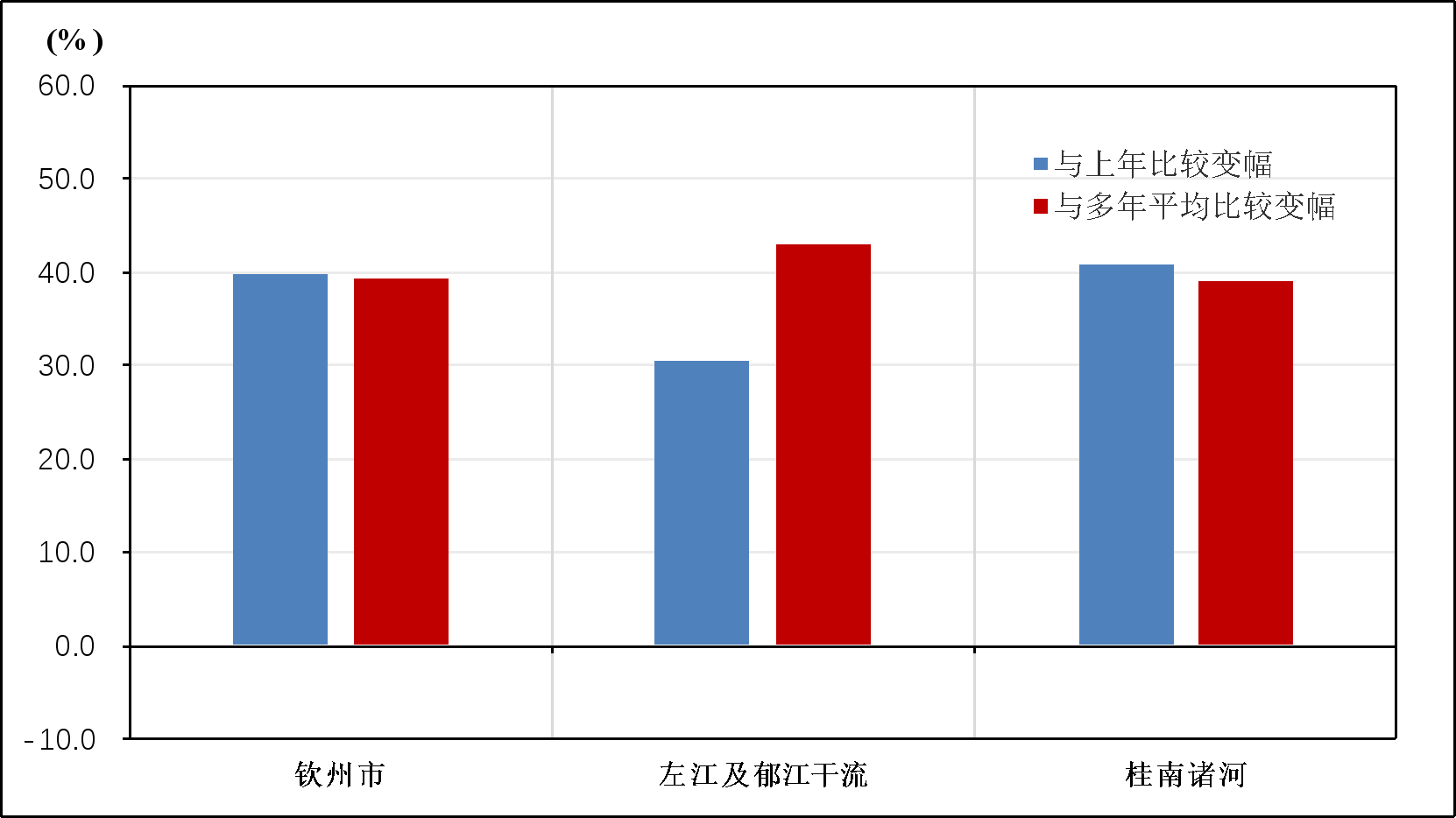 从水资源分区看,与2022年相比,左郁江、桂南诸河增幅分别为30.5%和40.9%。与多年平均值相比,左郁江、桂南诸河增幅分别为42.9%和38.9%。